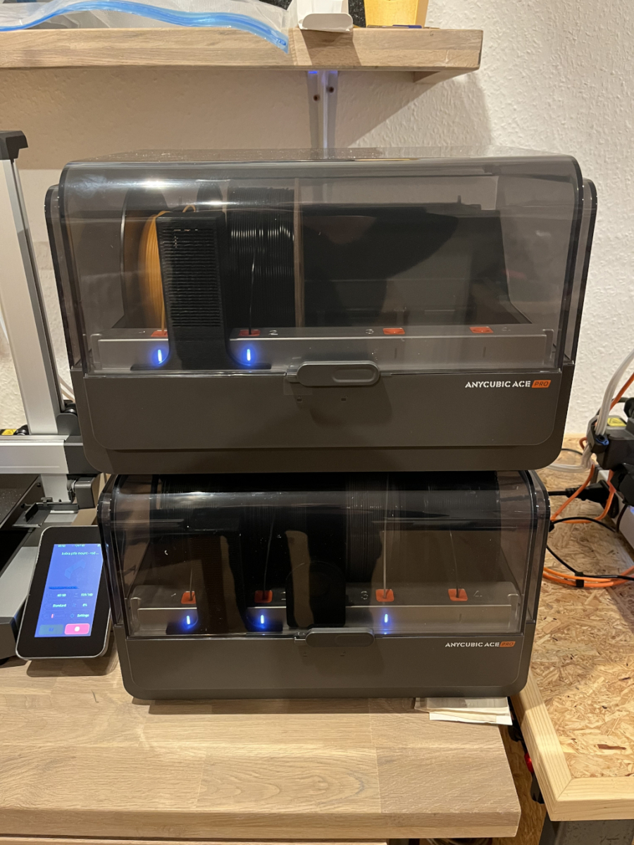 Der ACE Pro überraschte mich mit zwei Funktionen: Filamenterkennung via NFC-Ship und Filamenttrocknung. Hat eine Rolle einen NFC-Ship, wie das bei Anycubic der Fall ist, wir automatisch das Filament erkannt und dem Slicer mitgeteilt. Damit erfolgt die Filamentauswahl vollautomatisch. Die Trocknung erlaubt es, das Filament – zu trocknen… Hat man sich als Zubehör ein Hygrometer und Kasten für Silikatbeutelchen gedruckt, ist die Feuchtigkeit im ACE schnell weg. Generell eignet sich der ACE sehr gut zum Aufbewahren von Filamentrollen – vor allem PETG und PLA. Das ist natürlich immer abhängig von den Gegebenheiten…