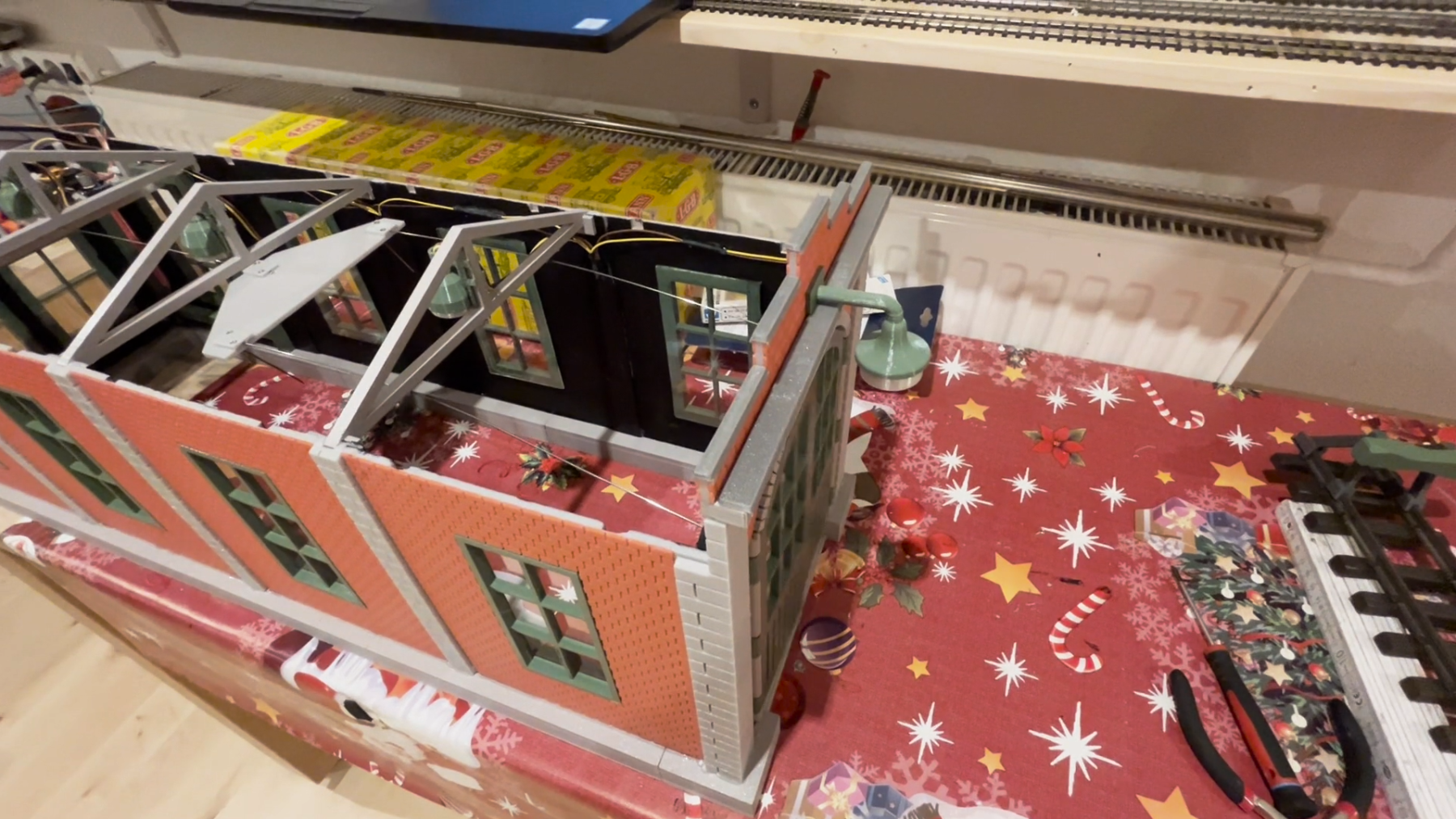• Das Dach ist mit eigenen Sparren versehen und verklebt, sowie die Dachplatten untereinander und mit einer aufgelegten „Gaube“ bzw. Art Firstpfanne. Damit kann das gesamte Dach abgenommen werden und wird nicht mit dem Lokschuppen verklebt.