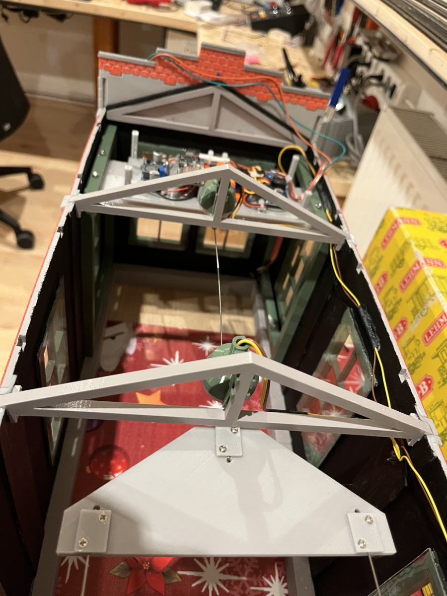 • Im Mittelbereich des Lokschuppens wird die Stange mit einem Dreieck auf zwei Stangen aufgeteilt, die zu den Türen gehen. Dort sind die Stangen ebenfalls mit einer kleinen Metallschrauböse an den Türen angebracht.