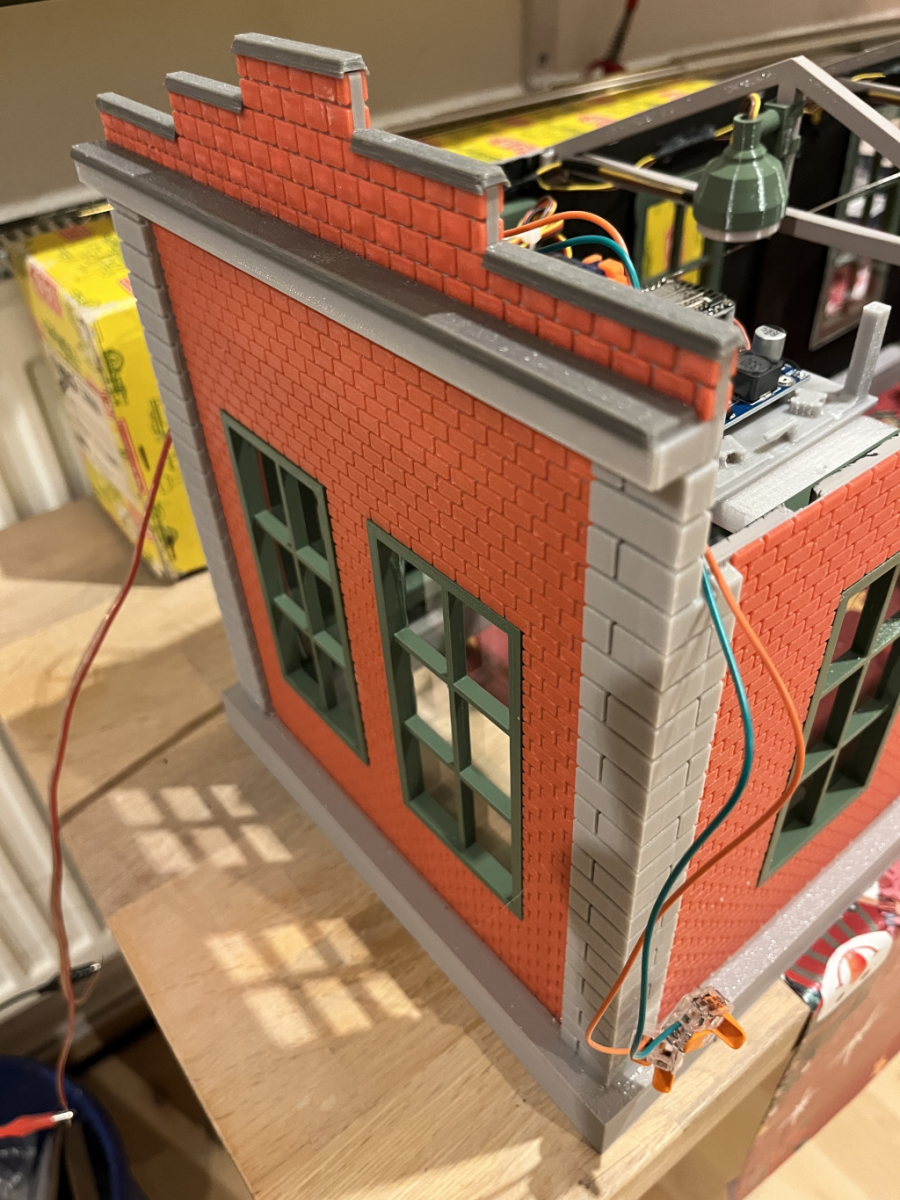 Eine kurze Idee von meinem Vater: Ich hätte ja gerne einen Lokschuppen – oder zwei. Der Eine soll etwa 70cm lang sein, damit das Krokodil da rein passt. Und der Andere etwas kleiner, für die Dampflok. Die Türen soll man auf und zu machen können. Am besten automatisch. Beleuchtung versteht sich natürlich von selbst. Ein Ziegelbau mit Blechdach wäre super, mit großen Fenstern. Und die grüne Farbe, die auch schon für andere Dinge verwendet wurde, soll mit drin sein. Man könnte ja alles in grau drucken und dann lackieren.