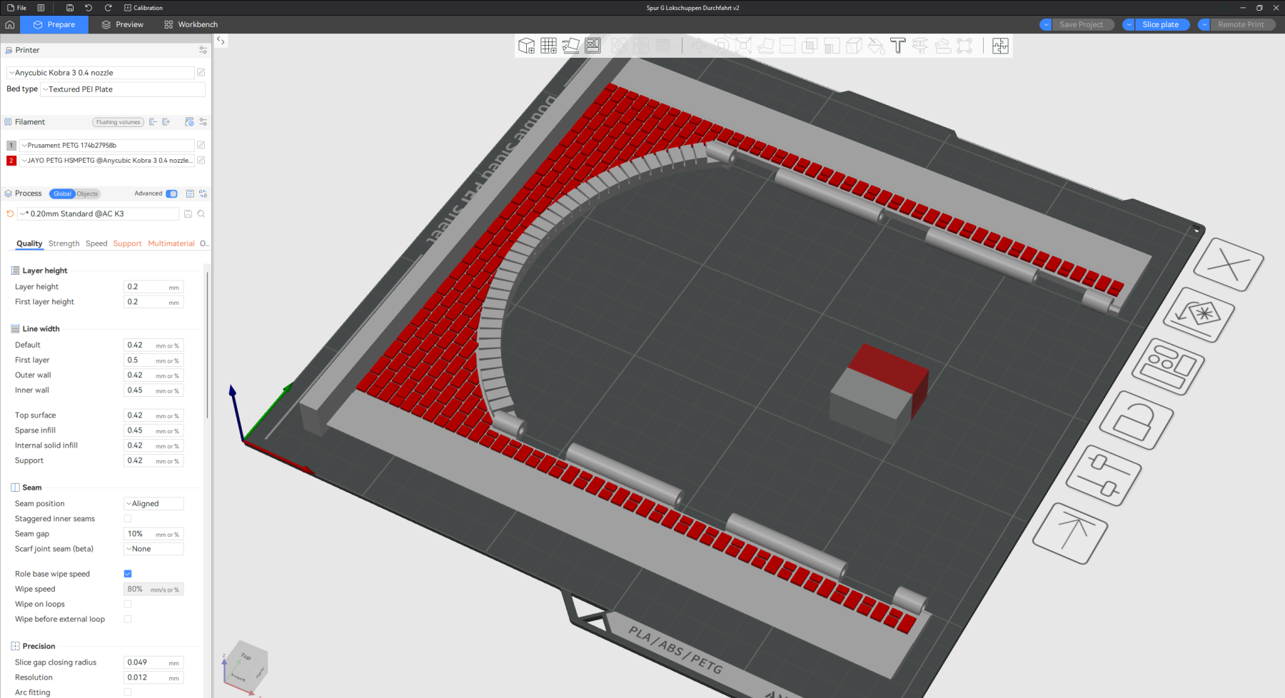Also schon ein paar Anforderungen an Design und Planung… Wobei ich uns das nachträgliche Anmalen schenken wollte. Wozu hat man schon auf einen (bzw. später zwei) Anycubic Kobra 3 mit ACE Pro aufgerüstet… Und entgegen den H0-Teilen, die ich in der Vergangenheit damit gedruckt hatte, wäre der Druck für Spur G sicherlich etwas einfacher.