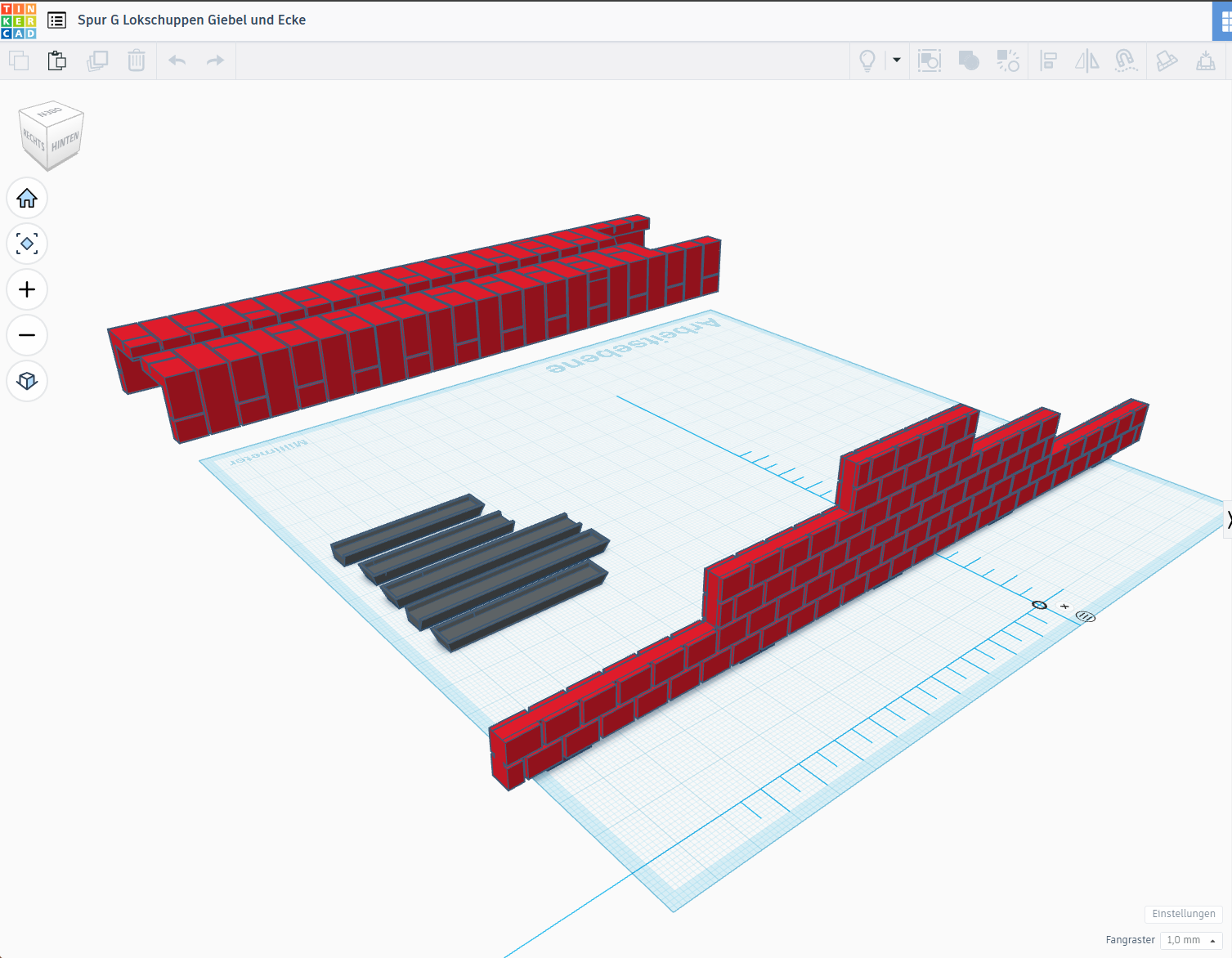 Eine kurze Idee von meinem Vater: Ich hätte ja gerne einen Lokschuppen – oder zwei. Der Eine soll etwa 70cm lang sein, damit das Krokodil da rein passt. Und der Andere etwas kleiner, für die Dampflok. Die Türen soll man auf und zu machen können. Am besten automatisch. Beleuchtung versteht sich natürlich von selbst. Ein Ziegelbau mit Blechdach wäre super, mit großen Fenstern. Und die grüne Farbe, die auch schon für andere Dinge verwendet wurde, soll mit drin sein. Man könnte ja alles in grau drucken und dann lackieren.