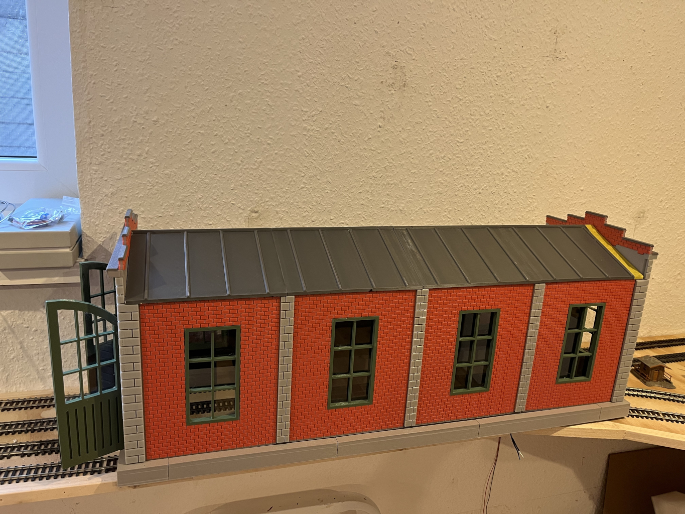 Moin… Was habe ich getan… Das war alles so gar nicht geplant, es sollte nur ein einfacher Lokschuppen werden. Nun habe ich ein voll in der Länge modulares Gebäude mit abnehmbarem Dach, Beleuchtung und Torsteuerung über Reedkontakte…