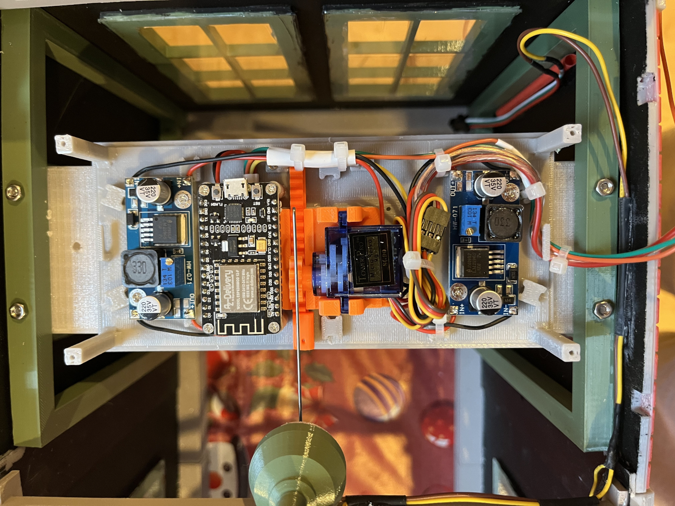 Zwei Stepdown-Module habe ich verbaut, weil ich bei ersten Tests Phänomene hatte, die ich nicht ganz zuordnen konnte. Der Servo lief unruhig und der ESP stürzte einfach im Betrieb ab – vor allem dann, wenn der Servo Leistung zog. Ich hatte da den Servo und den ESP noch am Breadboard angeschlossen. Ich vermute, dass da das Problem lag. Nachdem ich die Spannungsversorgung der beiden getrennt hatte (zwei Zuleitungen zum selben Netzteil), waren die Probleme weg. Mit zwei Stepdown-Modulen konnte ich sicher sein, dass sie sich nicht gegenseitig stören.